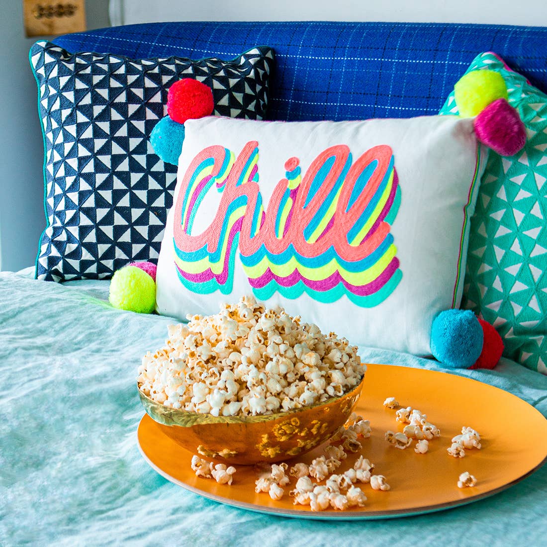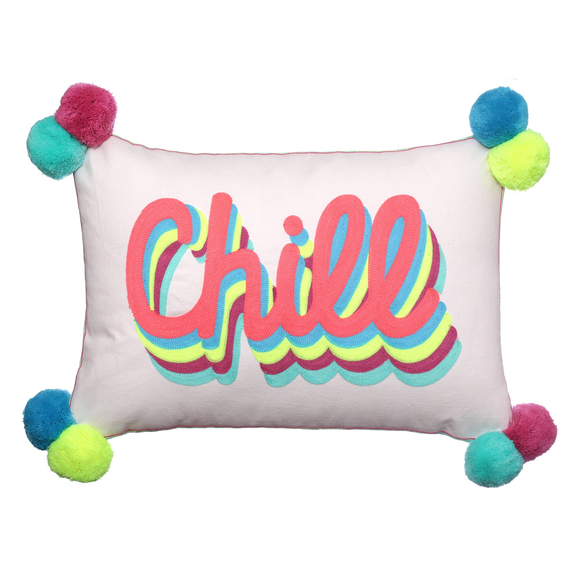 Just CHILL with this vivid cushion, designed to brighten your sofa and your day with its message in '60s style script and its rainbow-bright colours. Dry Clean Only