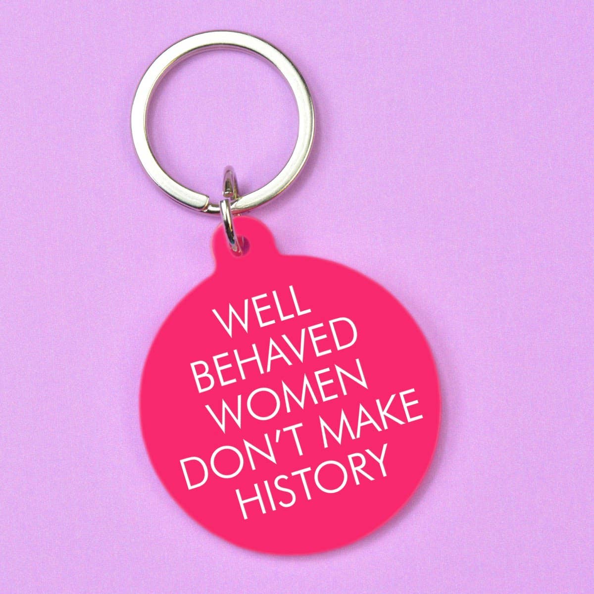 'Well behaved women don't make history' engraved on pink acrylic with white engraving and silver keyring.